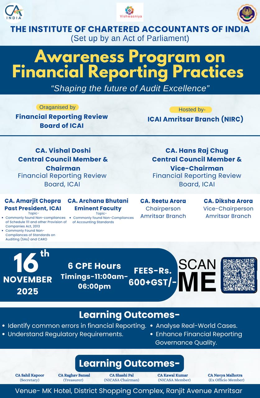 HomeSeminars/Conferences Upcoming Events Seminar / Conferences Webcast_AS 13 and 26_3 Webcast_AS 13 and 26_1 Webcast_AS 13 and 26_2 WordPress Grid Gallery Awareness Program on Financial Reporting Practices at M K Hotel, District Shopping Complex, Ranjit Avenue, Amritsar, on 16th November, 2025. Hotel Friends Regency, Ferozepur Road, Ludhiana, on 8th November, 2025 Awareness Program on Financial Reporting Practices at Hotel The Park, Connaught Place, New Delhi, on 13th September, 2025. Awareness Program on Financial Reporting Practices at Hotel Ramaya, Near Akashwani Campus Gwalior, on 28th August 2025. Awareness Program on Financial Reporting Practices at Hotel Atishay, R-55, Chetak Bridge, Zone-I, M. P. Nagar, Bhopal, 462011, on 26th July 2025. Awareness Program on Financial Reporting Practices at ICAI Bhawan, Lakhanpur, Kanpur, on 25th July 2025. Awareness Program on Financial Reporting Practices at Royal Park, Greater Kailash, Jammu on 5th July 2025 5. 4. 3. 2. 1. WordPress Grid Gallery 1 2 3 4 WordPress Grid Gallery 1 2 3 4 5 WordPress Grid Gallery IMG_5978 IMG_6021 IMG_6025 IMG_6085 WordPress Grid Gallery 1. 2. 3. WordPress Grid Gallery