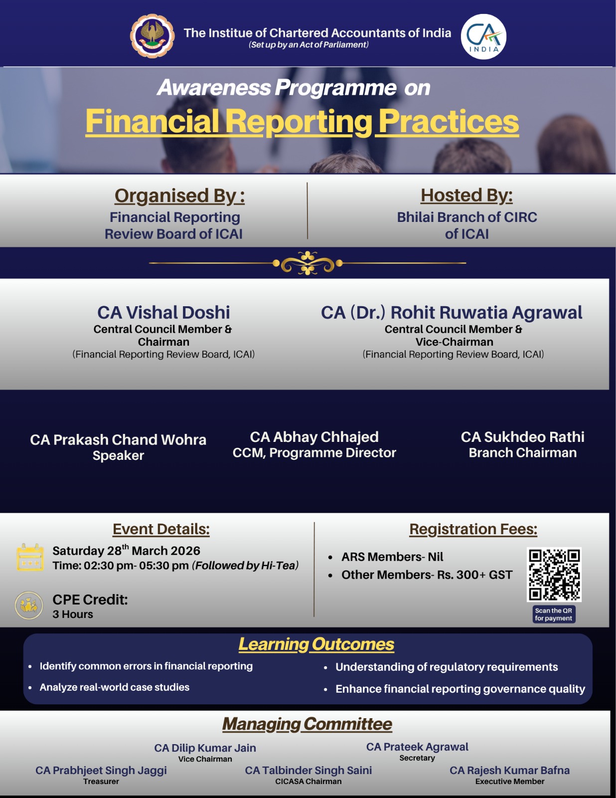 - Awareness Program on Financial Reporting Practices at ICAI Bhawan, Bhilai, New Civic Center- 490006, on 28th March, 2026